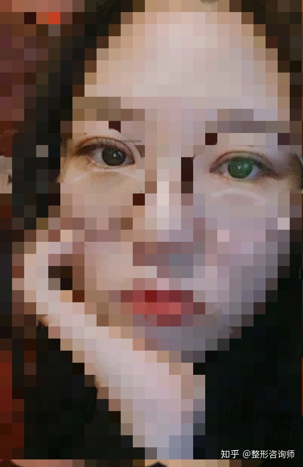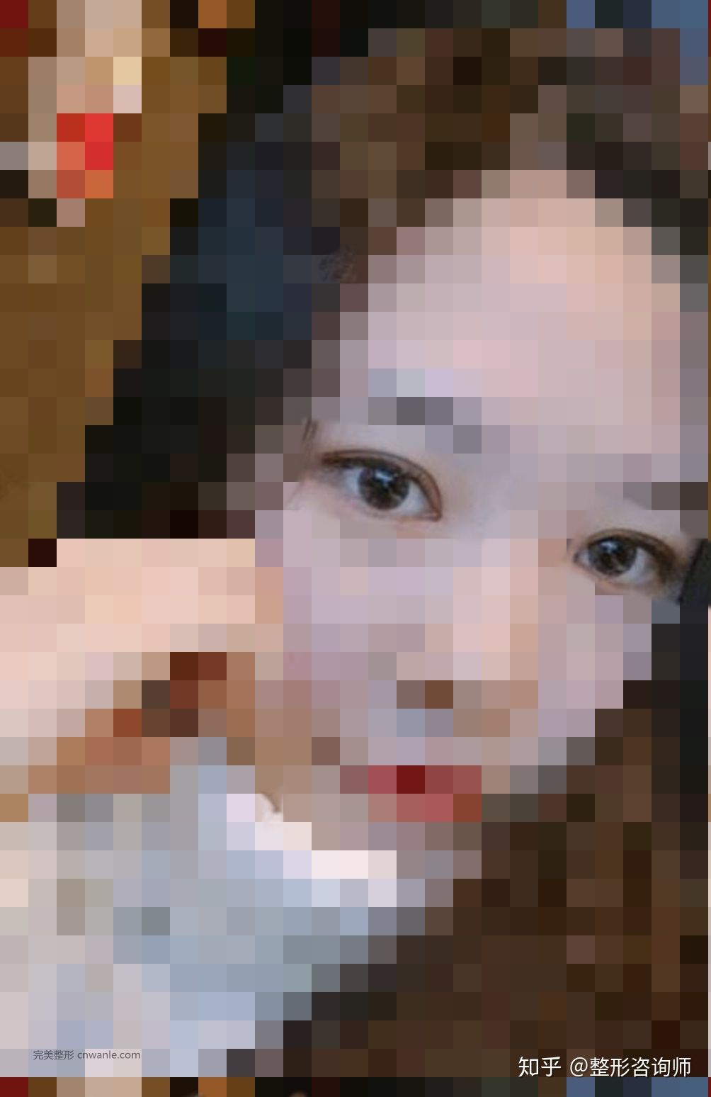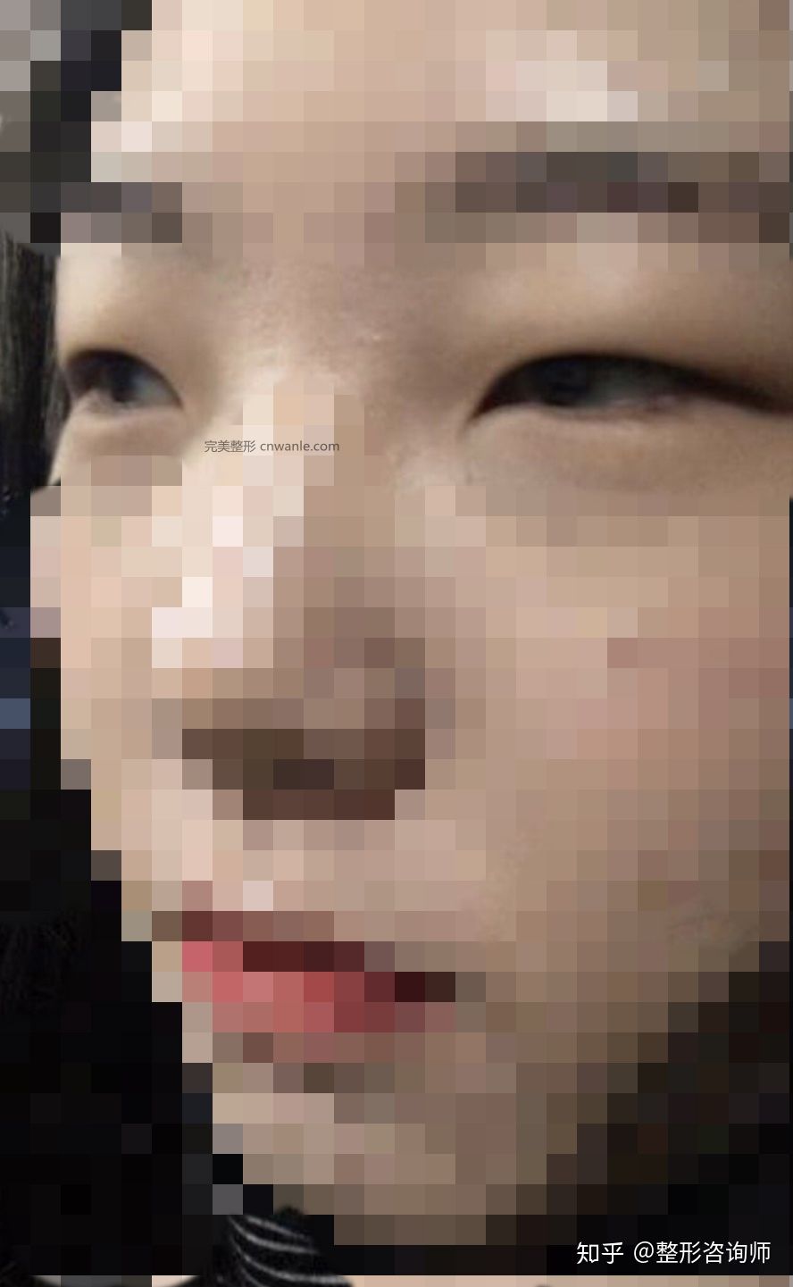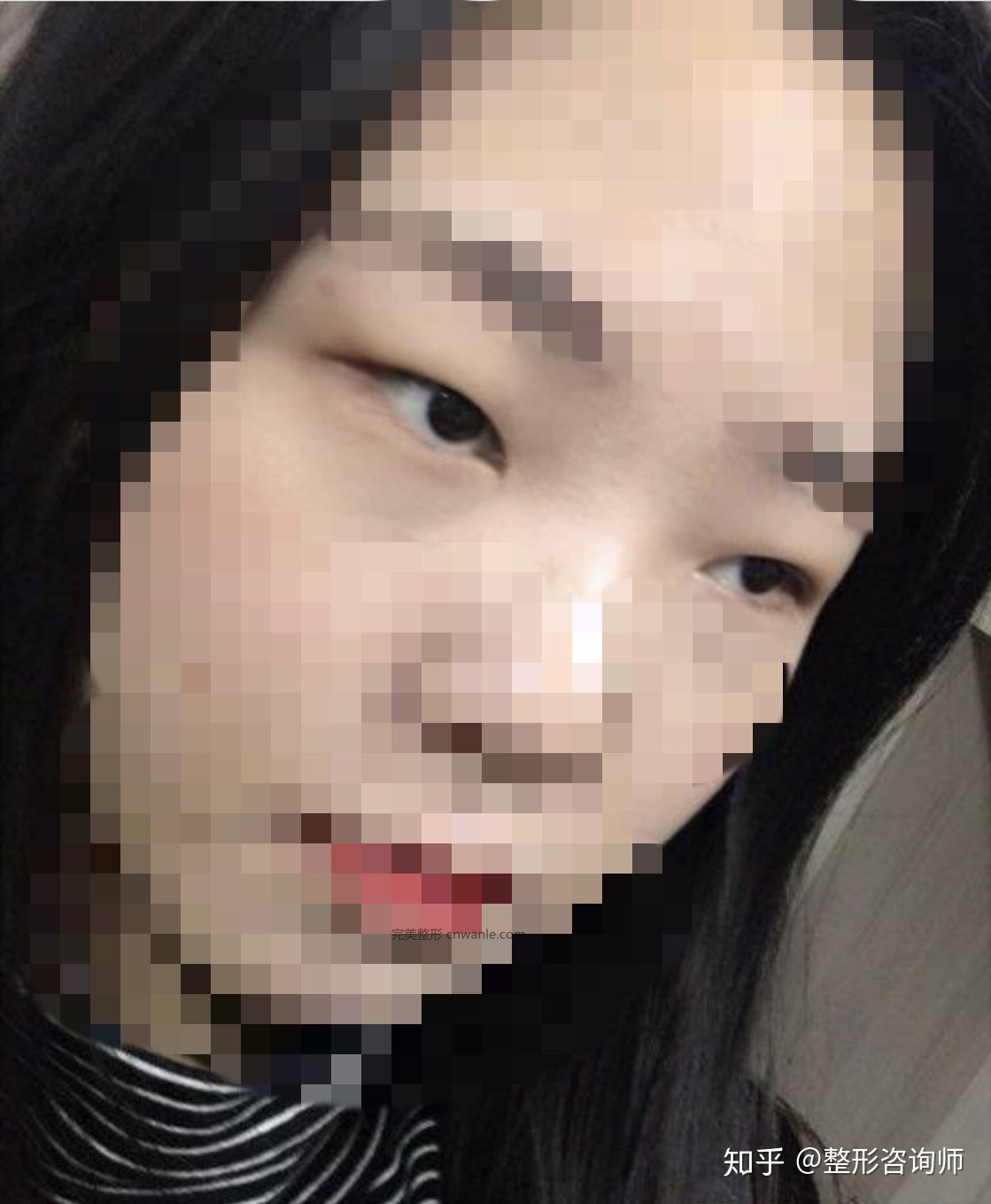 这是妹子做完手术一个月左右,眼皮还有点肿,戴了一副框架眼镜拍的,但是我打码打过头了把眼镜边框都给遮住了。。。(失误失误)