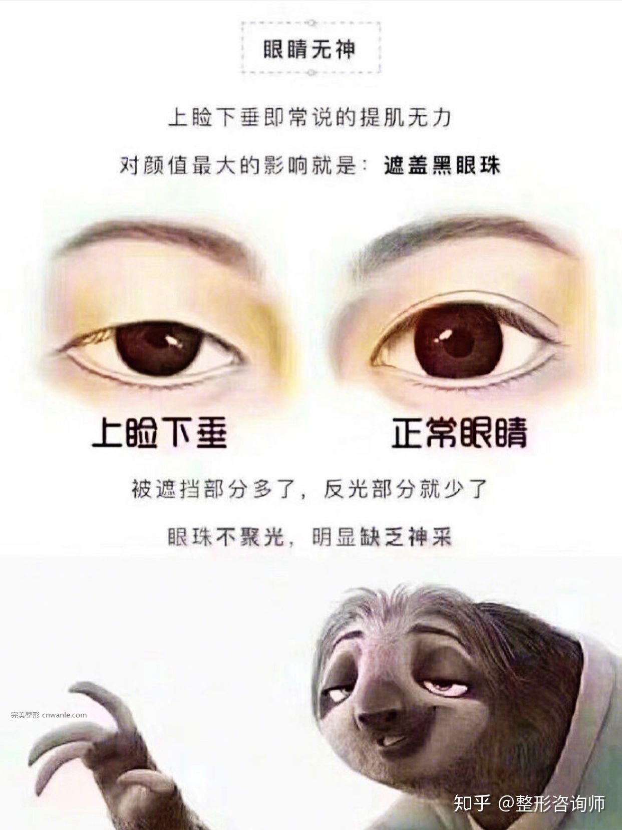 眼睛无神像树懒,也就是“提肌无力”,我们常说眼睛没的神~树懒就是典型的提肌无力,图片看上去可能很夸张,生活中也确实是有像树懒这种情况的重度上睑下垂,可以说这张图是非常的形象了,让大家可以很直观的看到,对比自己的眼睛情况~