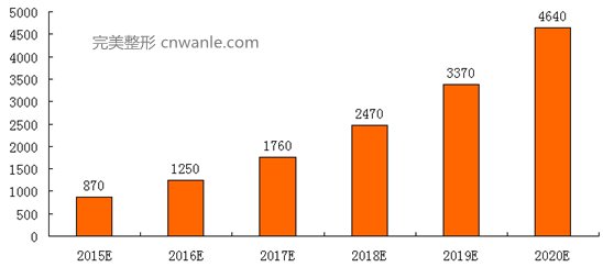 随着我国居民生活水平的提高,人们对个人美丽也越来越重视,医疗美容市场迎来快速发展的机遇。我国医美市场整体呈现出“总量大、人均低”的特点,2015年我国医疗美容市场规模为4640亿元,但每万人整容次数显著低于日本、韩国、台湾、泰国等东亚邻国(地区)。根据彭博预测,从2015到2025年我国中等收入以上人群比例将从33%上升到81%,中高收入人群的增加为医美市场的发展奠定基础;至2020年,我国医美市场有望达到4640亿元,复合增长率预计高达32%。