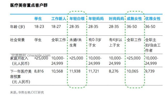 央广网曾报道,我国约有1万多家医疗美容机构,从业人员超过3000万。上述德勤的报告也显示,中国已经成为全球第三大医疗美容市场,未来3年增速领先全球;2020年预计达到4640亿人民币,年均复合增长率达到40%。中国医美市场的主要消费群体是28岁~35岁的年轻白领和36岁~50岁的成熟女性;非手术类美容治疗,主要以玻尿酸、肉毒素及皮肤护理项目成为未来行业热点。